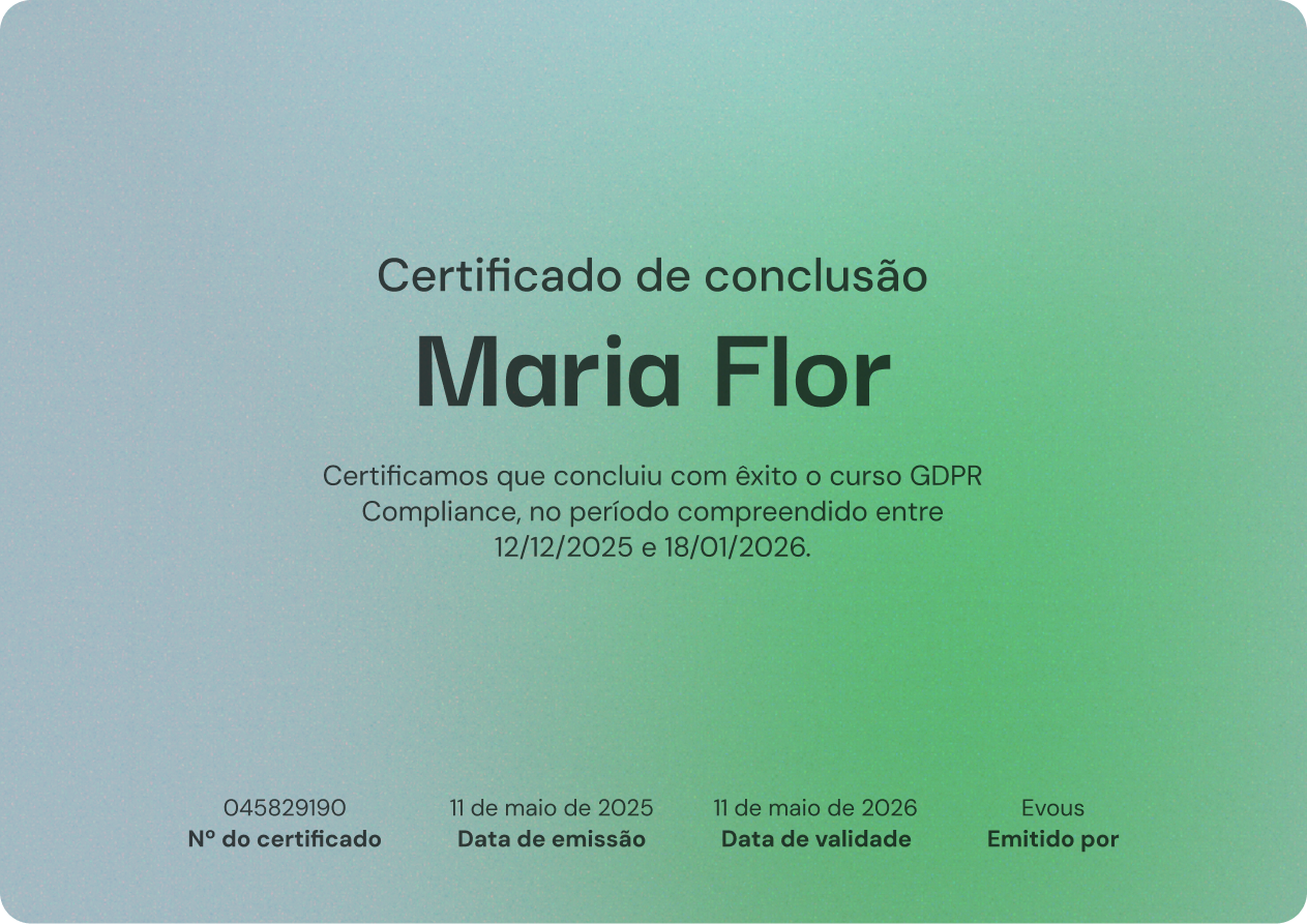 Cada conclusão gera um certificado — o colaborador vê que seu esforço tem resultado tangível.
