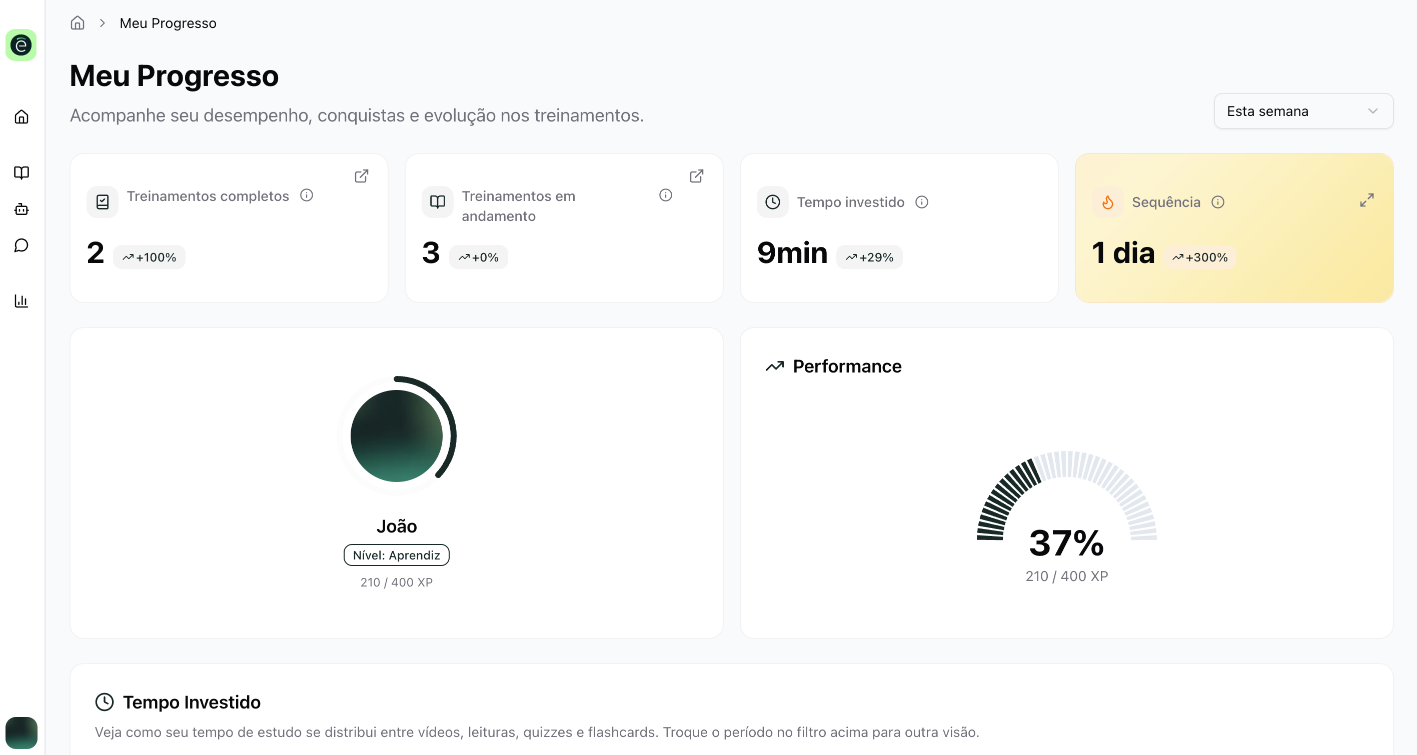 Cada aula, cada quiz, cada revisão faz o colaborador evoluir visivelmente.